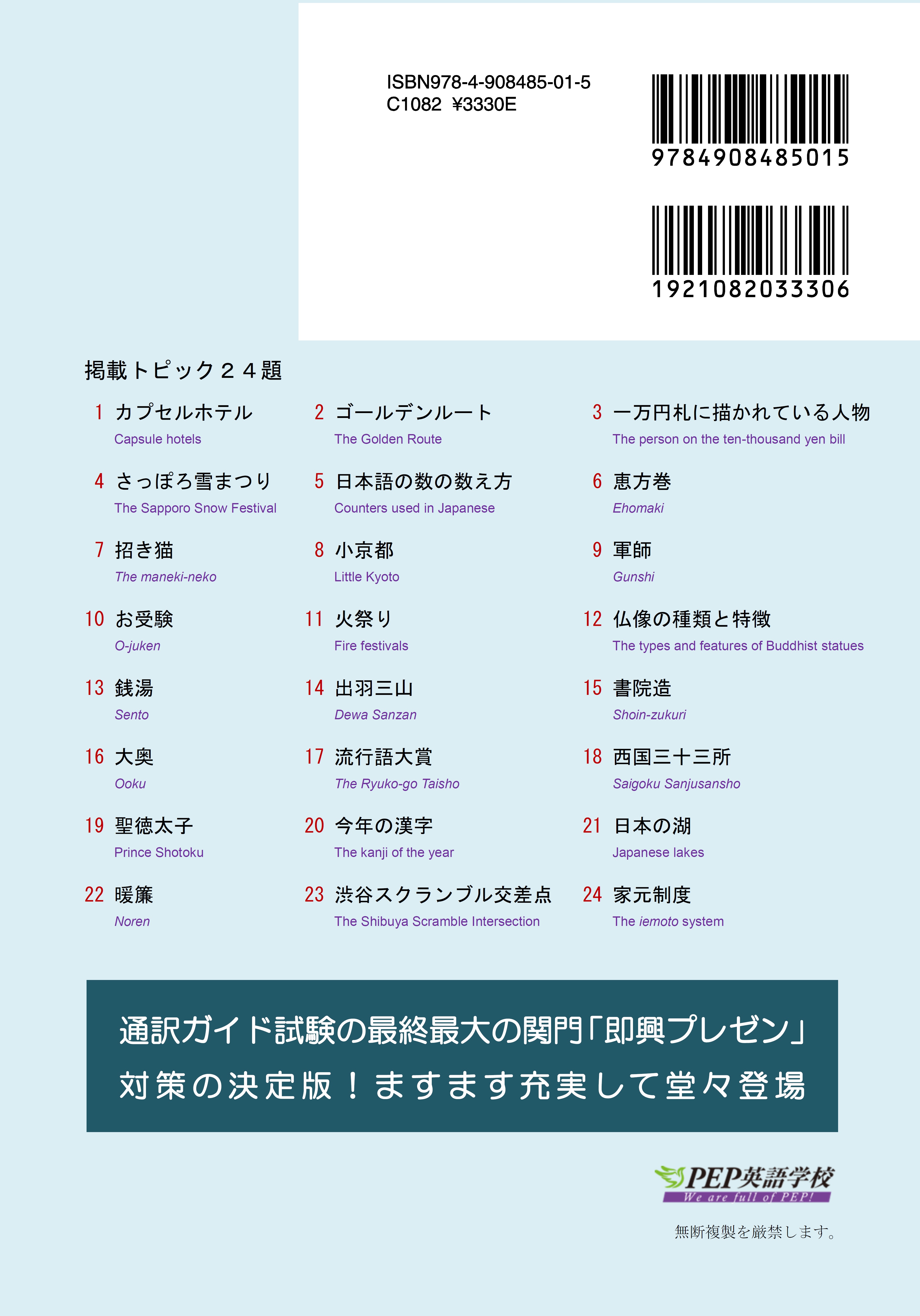 「通訳案内士試験はH25年度に新形式に移行し、過去問の蓄積が始まりました。フタを開けてみると「明治維新」「新幹線」「浮世絵」「正月」などの「定番トピック」が繰り返し出題されており、過去問研究の重要性はますます高まっています。本書を使って、重要トピックを、好評の「モデルプレゼン方式」でマスターしてください!