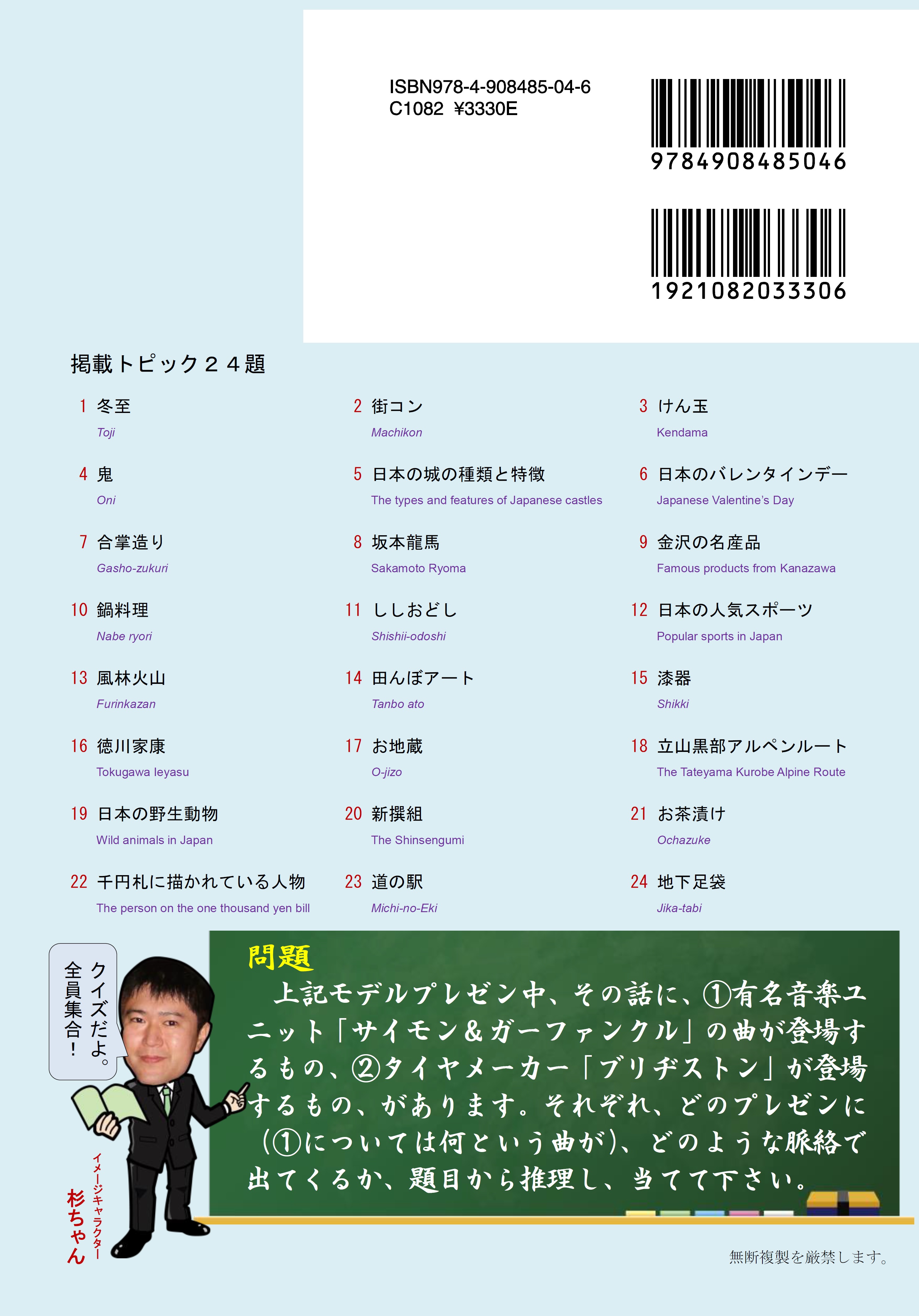 1.冬至、2.街コン、3.けん玉、4.鬼、5.日本の城の種類と特徴、6.日本のバレンタインデー 7.合掌造り、8.坂本龍馬、9.金沢の名産品、10.鍋料理、11.ししおどし、 12.日本の人気スポーツ、13.風林火山、14.田んぼアート、15.漆器、16.徳川家康、 17.お地蔵、18.立山黒部アルペンルート、19.日本の野生動物、20.新撰組、 21.お茶漬け、22.千円札に描かれている人物、23.道の駅、24.地下足袋