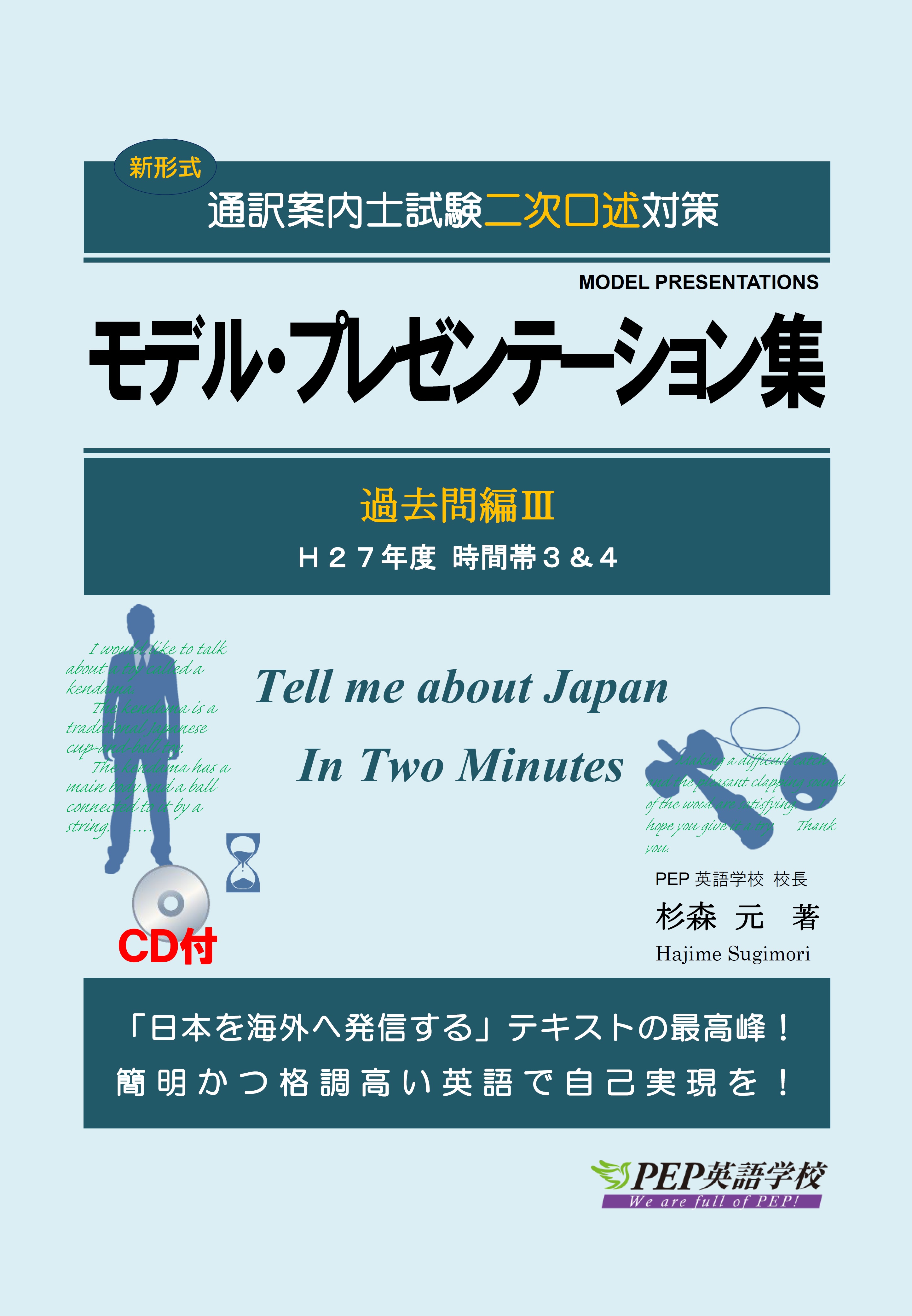 ※『モデル・プレゼンテーション集過去問編』に掲載されているプレゼン例と和訳は、『過去問詳解』掲載のものと同一ですが、『過去問詳解』と『モデル・プレゼンテーション集過去問編』は、前者が試験問題の概観をコンセプトにしているのに対し、後者は演習を眼目に置いているという点で、両者は守備範囲を異にします。よって、両書を併用されることをお勧めします。具体的には、以下の点が違います。 ①『過去問詳解』の解説は、語句解説であるのに対し、『モデル・プレゼンテーション集過去問編』の解説は、出題トピック内容分析、スピーチ構造に関する解説であること、②『モデル・プレゼンテーション集過去問編』は、英和見開き参照レイアウト、持ち運びしやすいA5サイズ等、演習に適したデザインを採っていること、③『モデル・プレゼンテーション集過去問編』には、朗読CDが付されていること