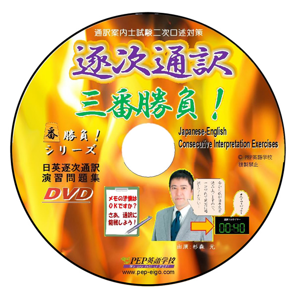 具体的には、まず本商品で学習を行う方に、DVD再生機とメモ用紙・筆記具を準備いただきます。次に本DVDを再生していただきますが、ここの動画においてはまず、試験管役の出演者が、本番と同様に日本文を読み上げる形で通訳問題を出します。読み上げ終了後、すぐに1分タイマーが画面に現れ、制限時間をカウントします。タイマーが動いている間に学習者は通訳を行います。タイムアップ後、出演者がモデル通訳を行います。学習者はこのモデルを聞き、かつ、そのスクリプト(ダウンロードで入手)を読むことにより、「どう言えばよかったか」を確認できます。サンプル動画をご覧ください。