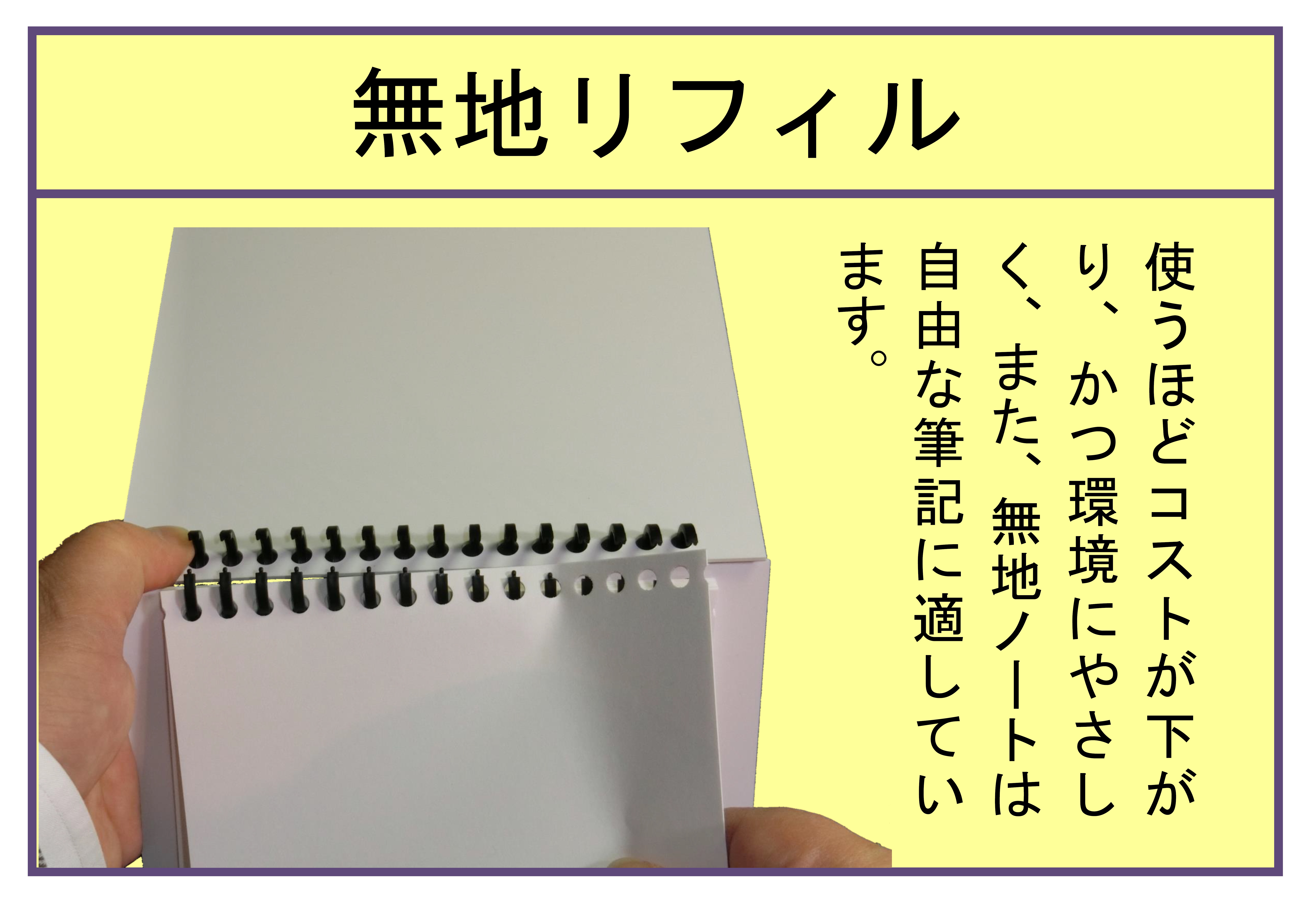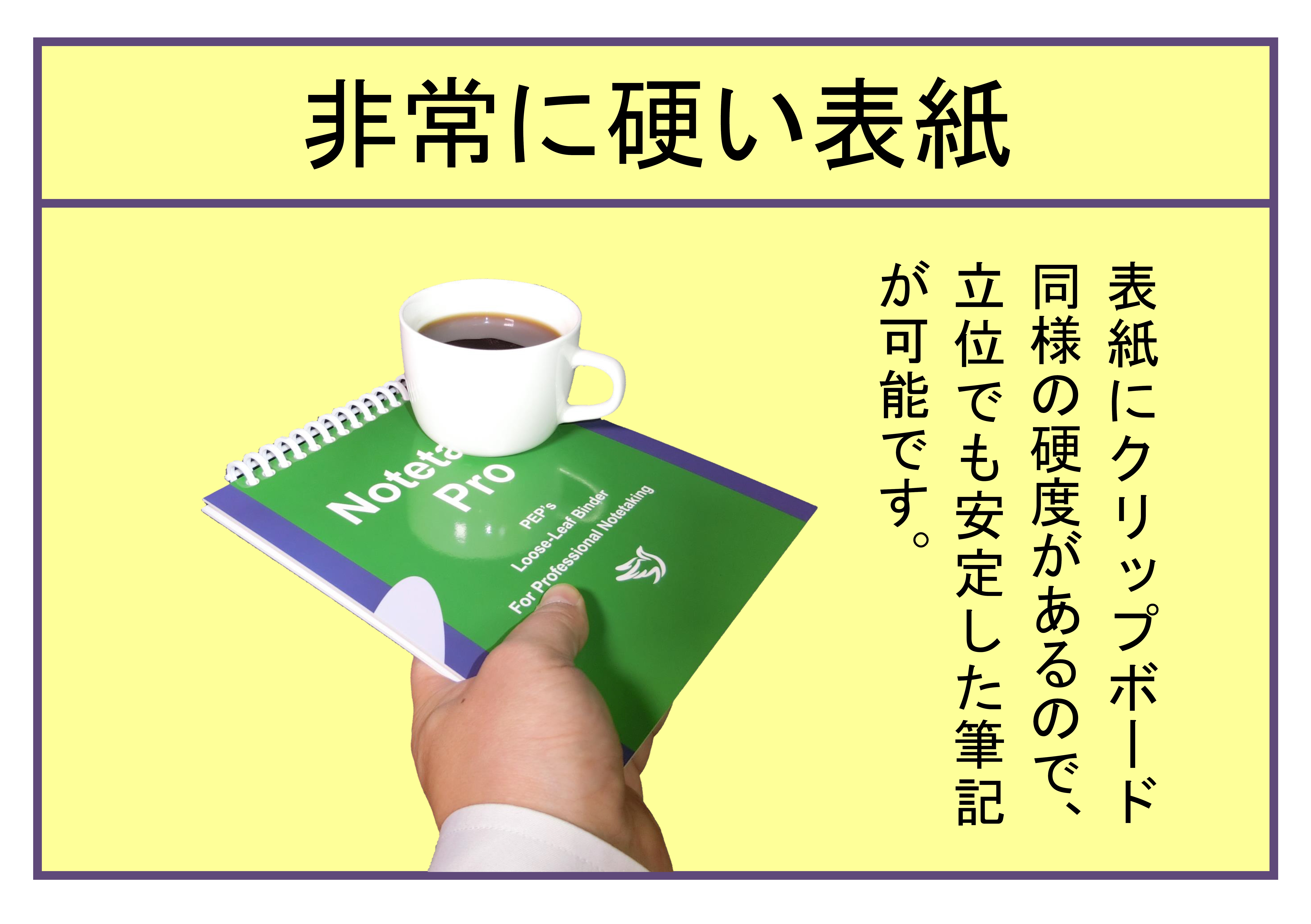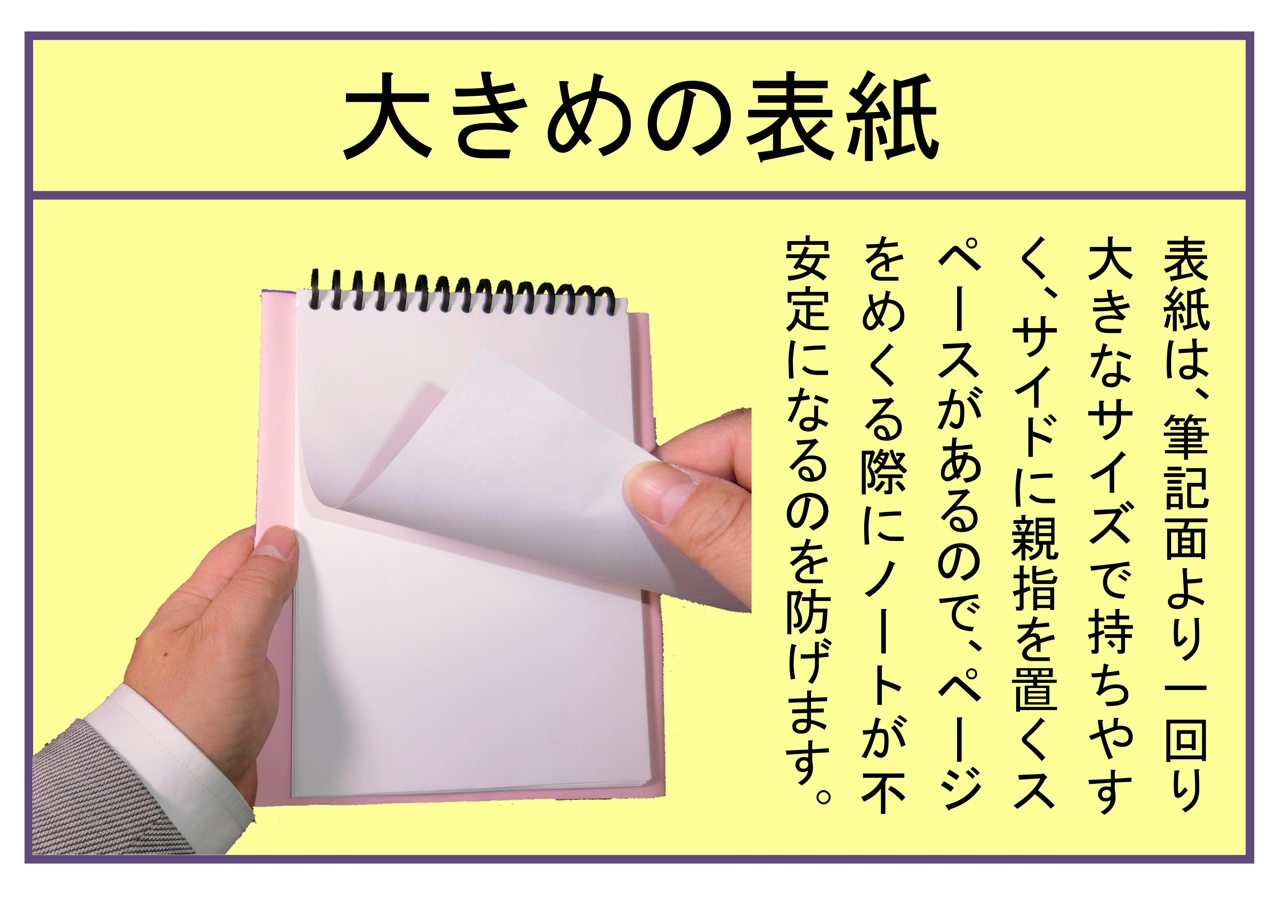 テーブルなしでメモをする場合、表紙に十分な硬さがないと、安定した筆記が困難になります。また、ノート用紙よりも表紙が一回り大きくないと、ページをめくる際、筆記帳本体を支えている手指を開く必要があり、本体を落としてしまう危険があります。しかし、だからといってクリップボードを用いると、リング綴じの利点(360°容易に開けてめくり易い)を享受できなくなります。