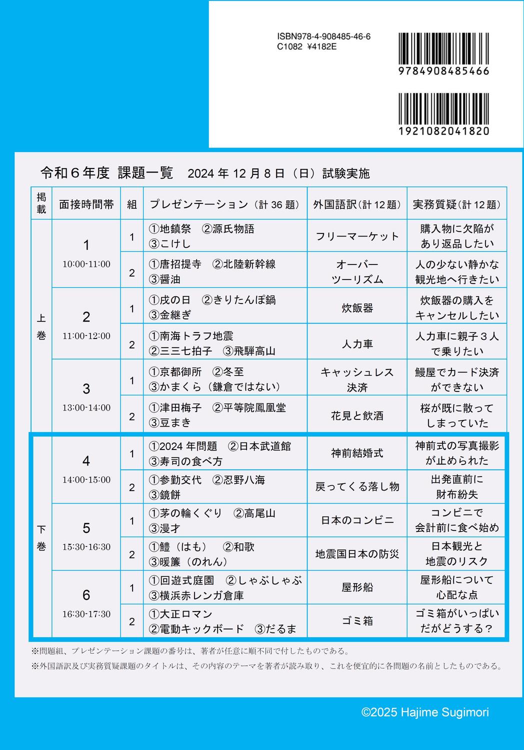 2024年度(令和6年度)の全国通訳案内士試験二次口述の出題を再現し、これに精緻な解答例と解説を付しました。全国通訳案内士試験(通訳ガイド試験)二次口述の全容を明らかにする唯一の書籍シリーズ。全出題(「プレゼンテーション」「実務質疑」「外国語訳」)を、上下巻でカバーしています。