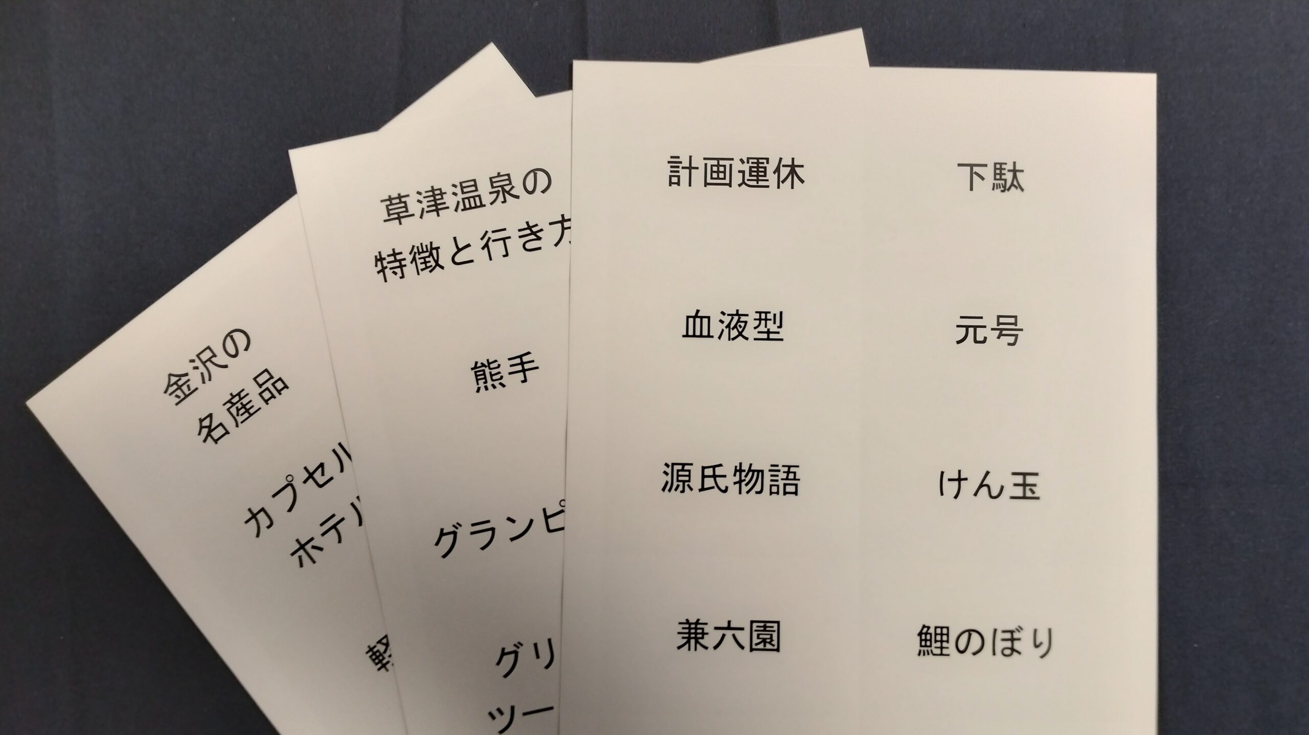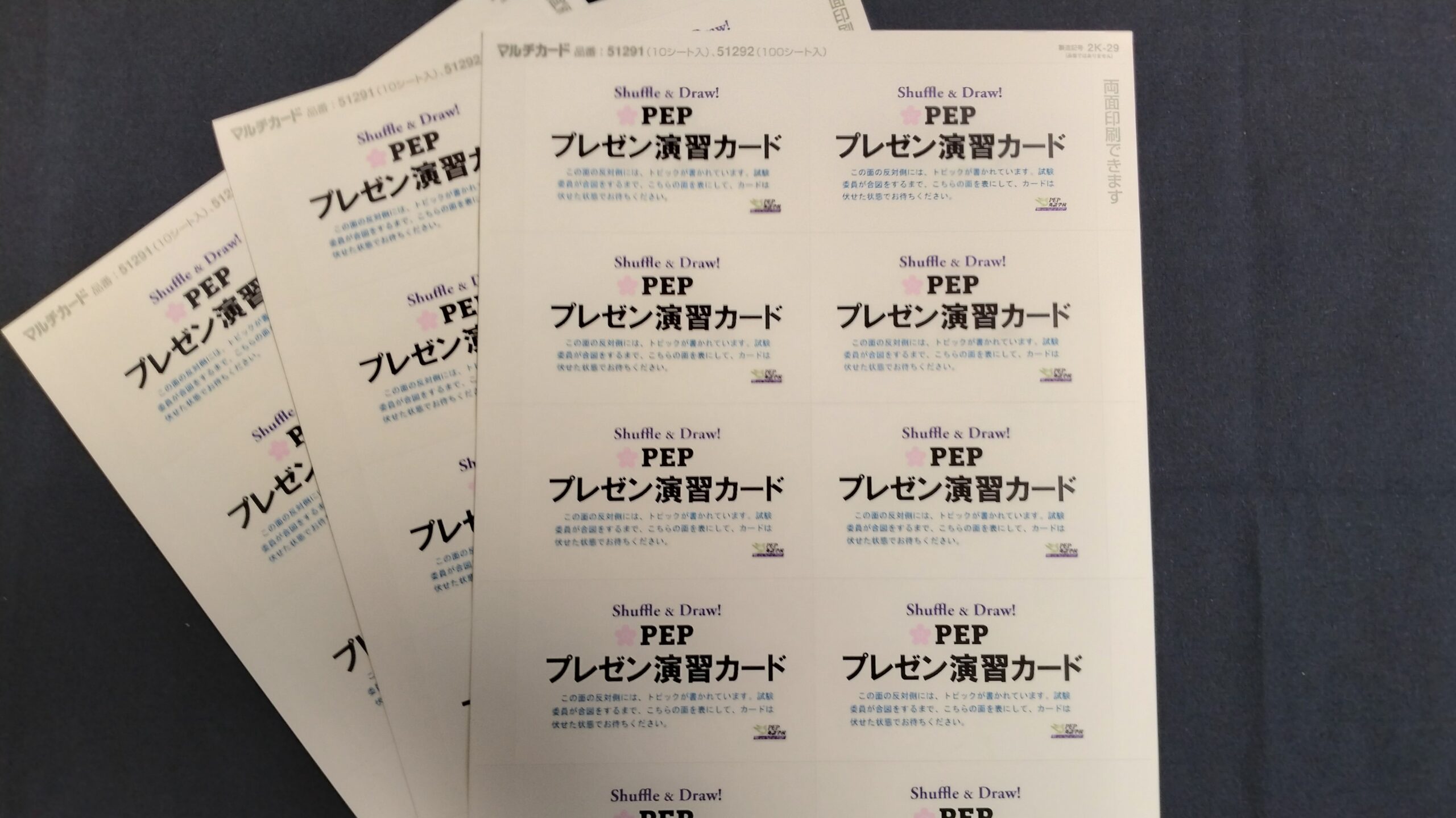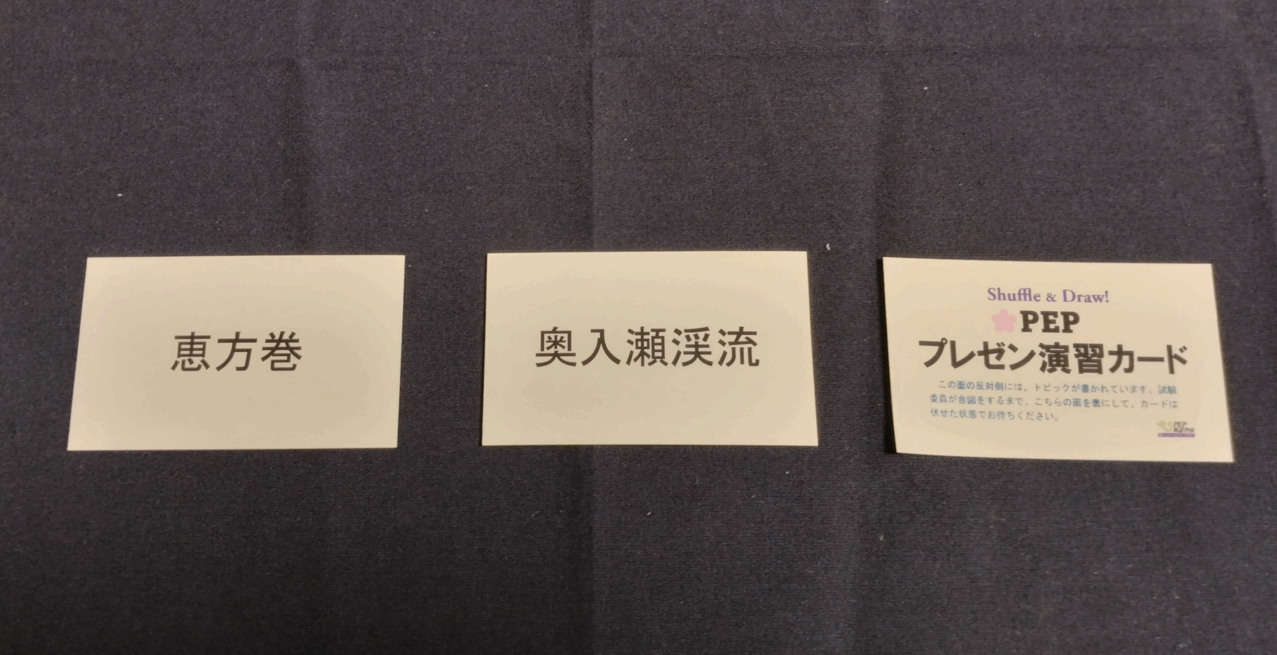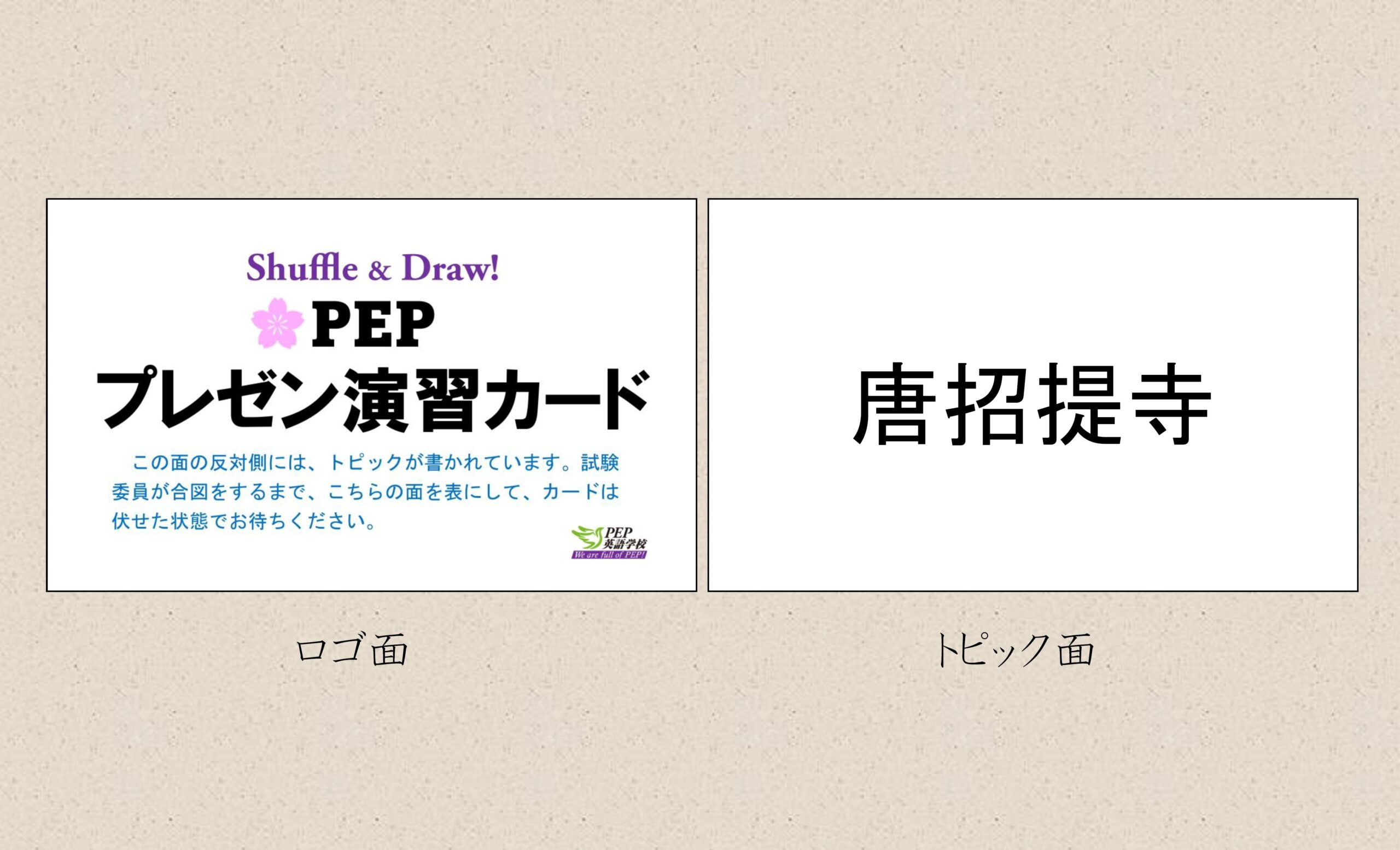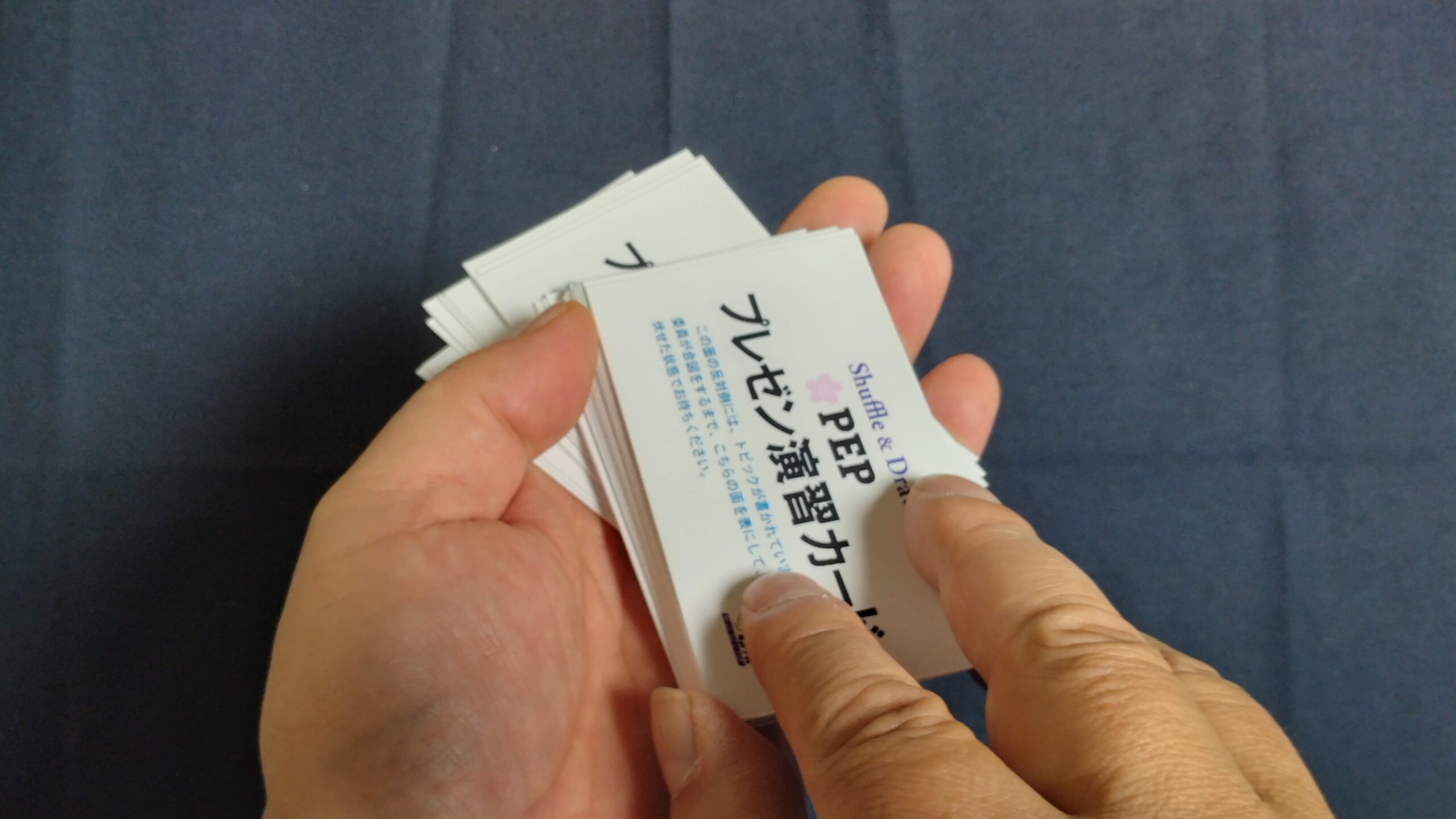 同課題で出されるトピック(予想問題と普遍的過去問)が、各カード(名刺サイズ)に書かれています。学習者は、これをトランプのようにシャッフルし、裏返したまま3枚ひき、動画教材「プレゼン演習タイマー」に合わせて演習します。これで、本番とソックリの体験が独学で可能となります。